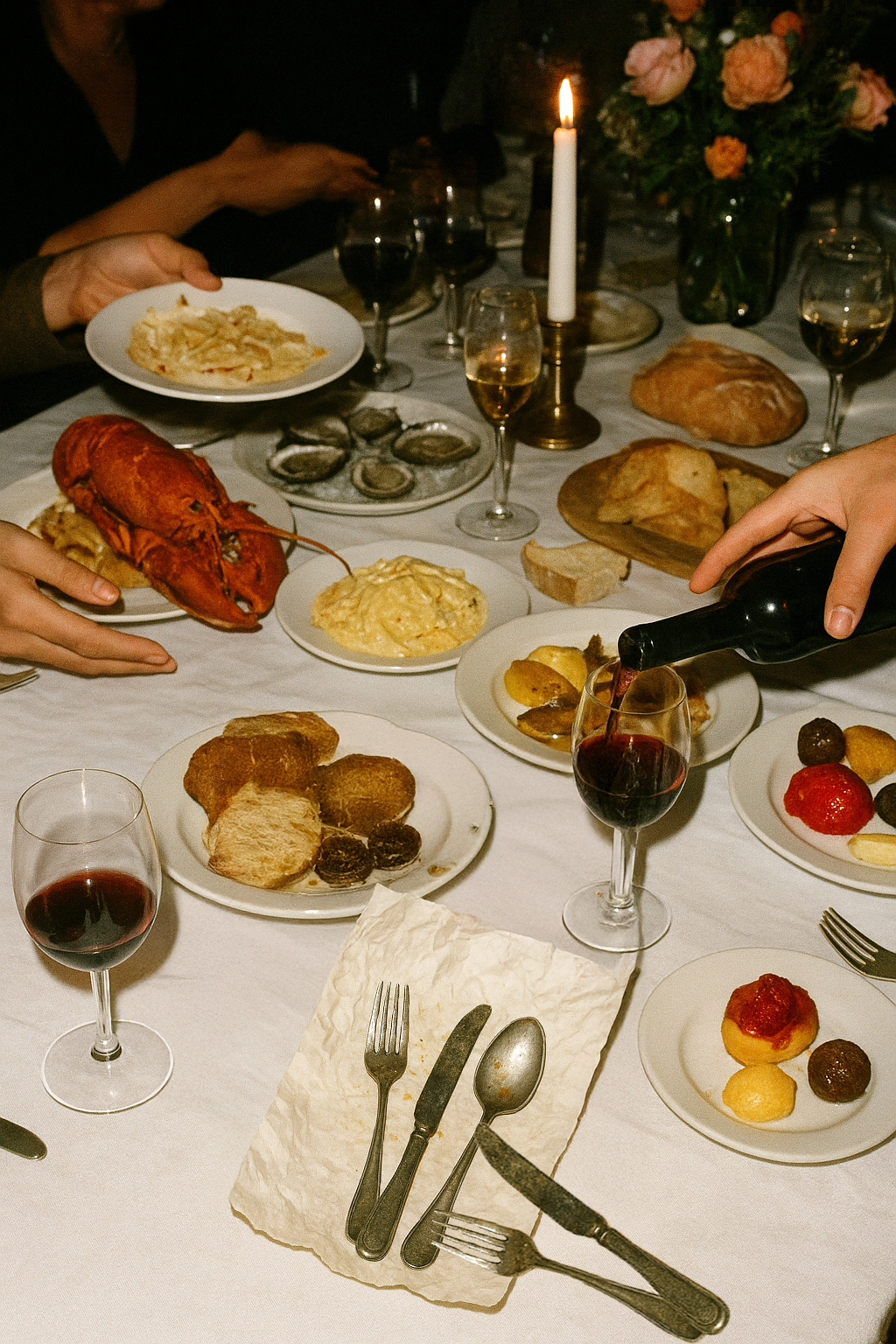 Reinterpreting the project with AI, I created an elaborate setting: a luxurious dinner arrangement in which a simple piece of paper served as a place for dirty cutlery.