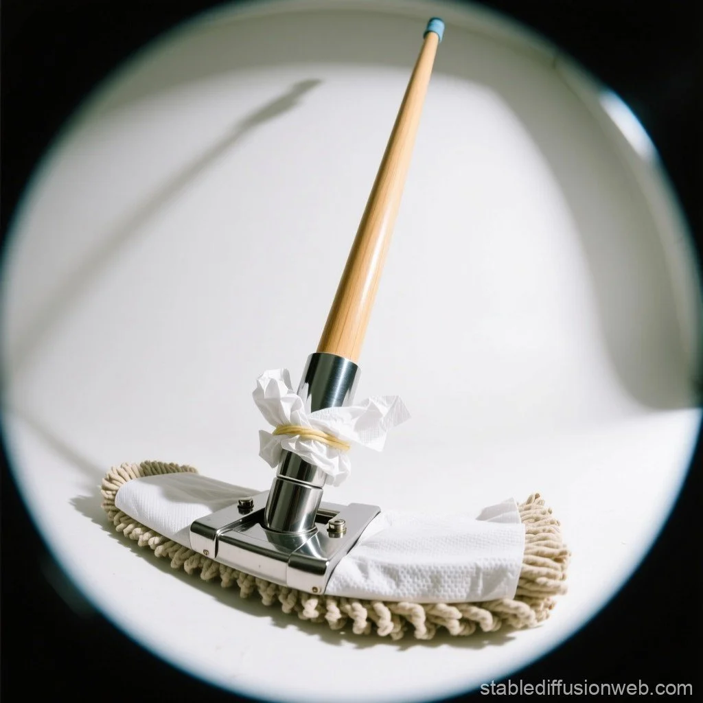 Vintage fisheye lens effect exaggerates the perspective, while the soft, slightly blurred background keeps focus on the unique textures of the mop and the rebellious DIY solution of the tissue binding.
